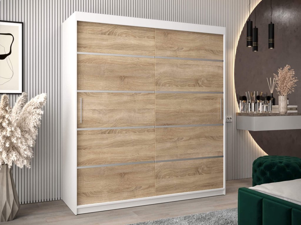Priestranná šatníková skriňa Alyxia 180/200 v modernej kombinácii bielej s dubom sonoma Vám ponúkne dostatok úložného priestoru. Skriňa je vyrobená z vysoko kvalitnej laminovanej dosky (DTD) o hrúbke 16 mm, ktorá je odolná voči poškriabaniu, vlhkosti a vysokej teplote. Hrany skrine sú upravené kvalitnou PVC dyhou. Použitý je posúvný systém ,,BIMAK“ a hliníkové vodidlá, ktoré Vám zaručia pohodlné otváranie a zatváranie dverí. Vnútro skrine je rozčlenené na tri časti. Po stranách je tvorená štyrmi policami, ktoré vytvoria päť praktických úložných priestorov a v strede sa nachádza jedna polička a dve vešiakové tyče.