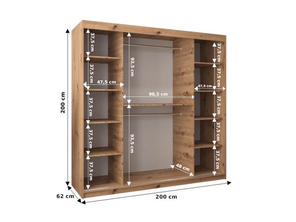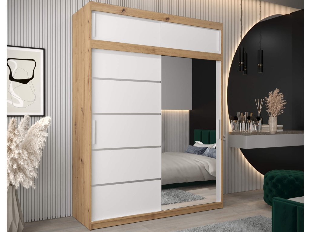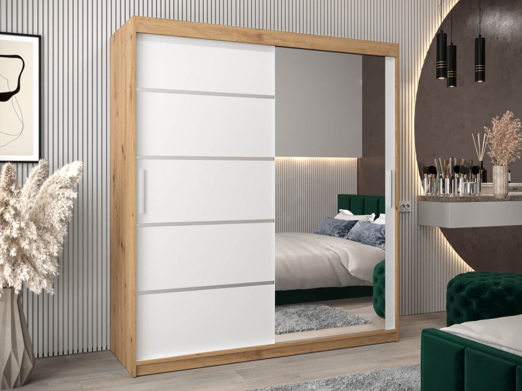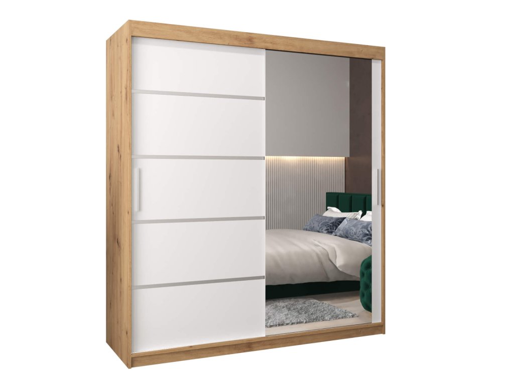 Široká šatníková skriňa Alyxia II 180/200 v modernej dvojfarebnej kombinácii (dub artisan / biela) a so zrkadlom na pravej strane. Skriňa Vám ponúkne dostatok úložného priestoru na Vaše oblečenie. Je vyrobená z vysoko kvalitnej laminovanej dosky (DTD) o hrúbke 16 mm, ktorá je odolná voči poškriabaniu, vlhkosti a vysokej teplote. Hrany skrine sú upravené kvalitnou PVC dyhou. Použitý je posúvný systém ,,BIMAK“ a hliníkové vodidlá, ktoré Vám zaručia pohodlné otváranie a zatváranie dverí. Vnútro skrine je rozčlenené na tri časti. Po stranách je tvorená štyrmi policami, ktoré vytvoria päť praktických úložných priestorov a v strede sa nachádza jedna polička a dve vešiakové tyče.