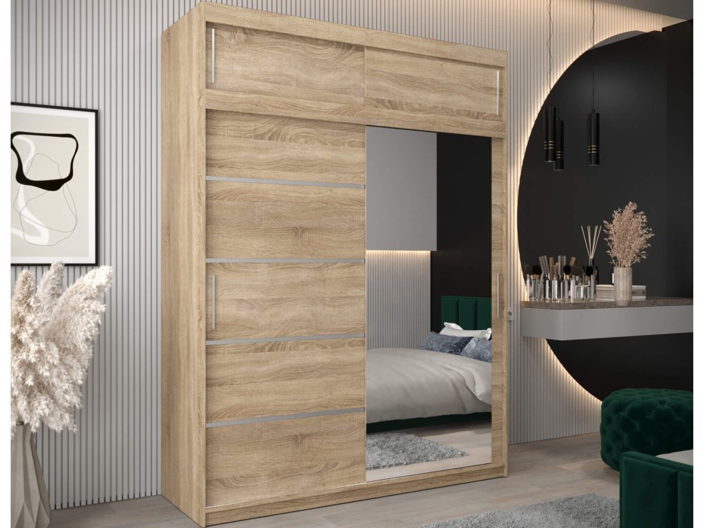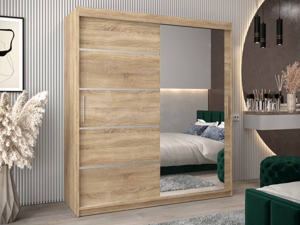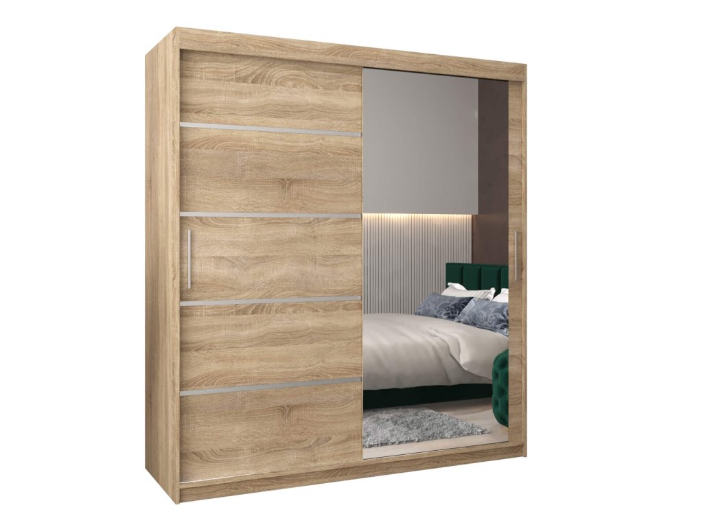 Priestranná šatníková skriňa Alyxia II 180/200 vo farbe dub sonoma so zrkadlom na pravých dverách. Je vyrobená z vysoko kvalitnej laminovanej dosky (DTD) o hrúbke 16 mm, ktorá je odolná voči poškriabaniu, vlhkosti a vysokej teplote. Hrany skrine sú upravené kvalitnou PVC dyhou. Použitý je posúvný systém ,,BIMAK“ a hliníkové vodidlá, ktoré Vám zaručia pohodlné otváranie a zatváranie dverí. Vnútro skrine je rozčlenené na tri časti. Po stranách je tvorená štyrmi policami, ktoré vytvoria päť praktických úložných priestorov a v strede sa nachádza jedna polička a dve vešiakové tyče.