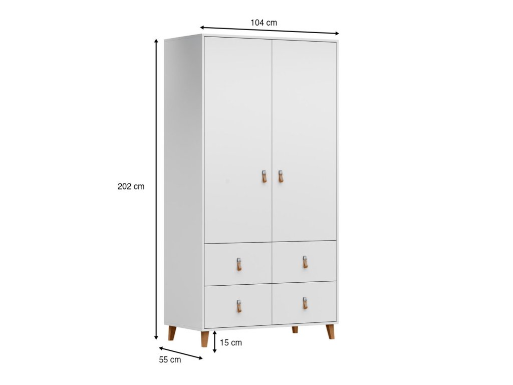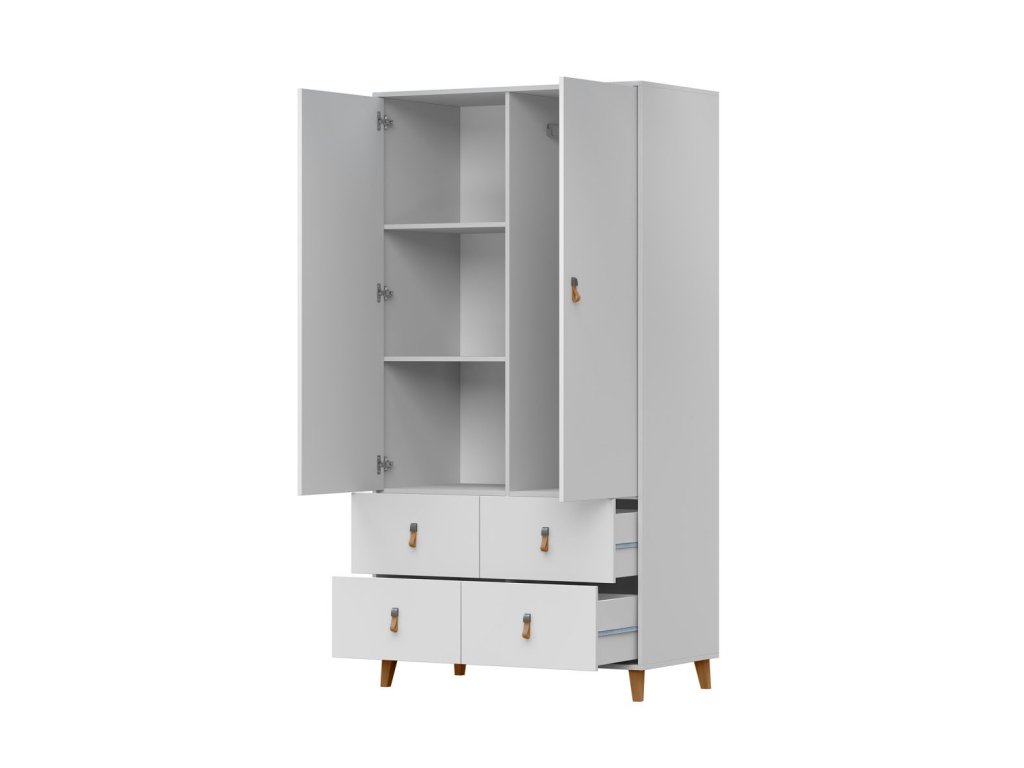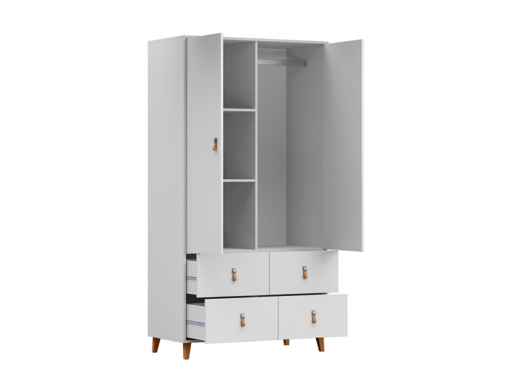 Priestranná šatníková skriňa je vhodná pre umiestnenie do detskej alebo študentskej izby. Skriňa dvojdverová a v spodnej časti sa nachádzajú 4 zásuvky a vo vrchnej časti sú dve police na jednej strane a vešiaková tyč na druhej strane.