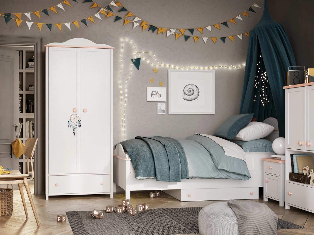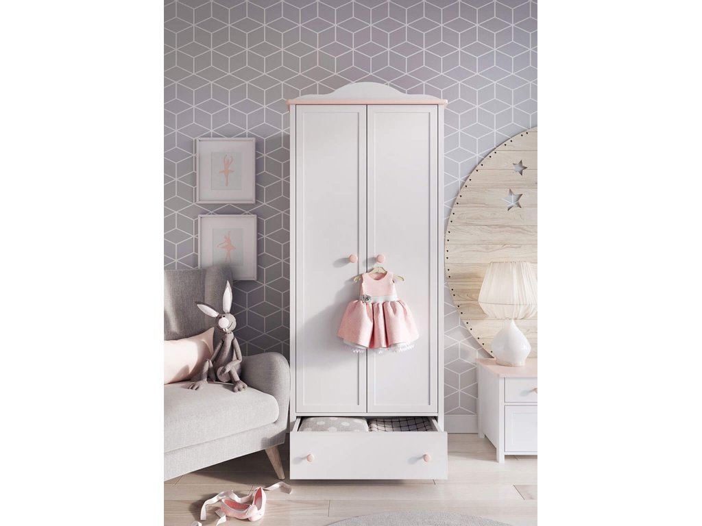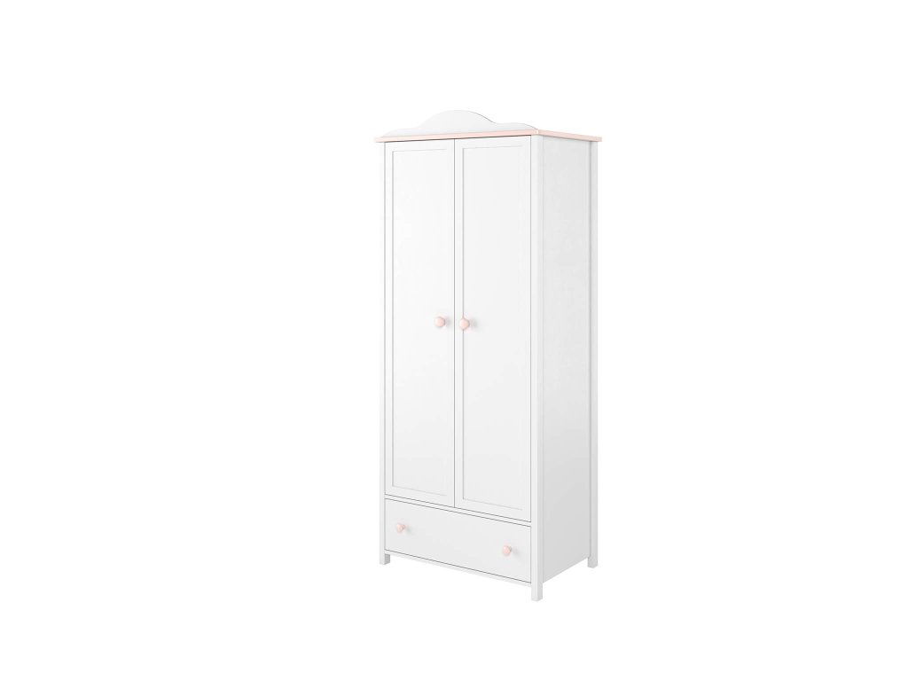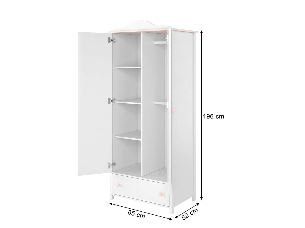Biela šatníková skriňa LUNA s úchytkami v púdrovo ružovej farbe navrhnutá do dievčenskej detskej izby. Polovicu skrine tvoria štyri priestranné police, druhá časť skrine je určená na vešanie oblečenia a v spodnej časti sa nachádza veľká zásuvka na spodnú bielizeň. Pre lepšiu organizáciu si môžete spodný šuflík rozčleniť košíkmi a úložnými boxmi na menšie časti. Šatníková skriňa je vyrobená z kvalitnej laminovanej dosky (DTD) s odolnou ABS hranou. Úchytky na dierkach a zásuvke sú plastové.