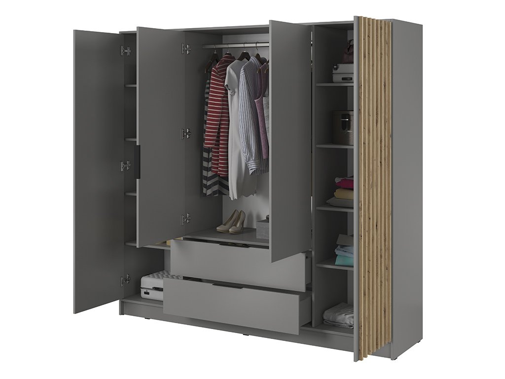 Súčasným trendom podlieha aj štvordverová šatníková skriňa Nelly 4D. Disponuje veľkým úložným priestorom a svojím moderným farebným prevedením sa dokonale hodí do každej domácnosti na uloženie oblečenia ale aj vecí každodennej činnosti. V stredovej časti sú 2 priestranné zásuvky nad ktorými sa nachádza veľký priestor s vešiakovou tyčou na zavesenie šiat, búnd ale aj košieľ. Bočné časti sú vybavené policami čo zabezpečí, aby ste mali v oblečení stále poriadok. Dokonalý vzhľad vytvárajú dekoračné lamely vo farbe dub artisan. Skriňa je vyrobená z kvalitnej laminovanej dosky s hrúbkou 16 mm, ktorá je zakončená ABS hranami. Úchyty sú z plastu v čiernej farbe.
