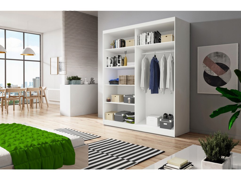 Priestrannú viacúčelovú šatníkovú skriňu je možné umiestniť do akejkoľvek miestnosti. Šatníková skriňa s posuvnými dverami Vám poskytne dostatok úložného priestoru. Vnútro skrine je rozdelené na dve časti. Skriňa disponuje šiestimi policami a vešiakovou tyčou na zavesenie oblečenia. Skriňa je vyrobená z vysoko kvalitnej laminovanej dosky s hrúbkou 16 mm. Kľučky skrine sú vyrobené z PVC. Posuvné dvere zabezpečia pohodlné zatváranie a otváranie skrine. Môžete si vybrať z niekoľkých farebných prevedení.