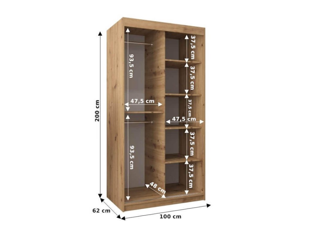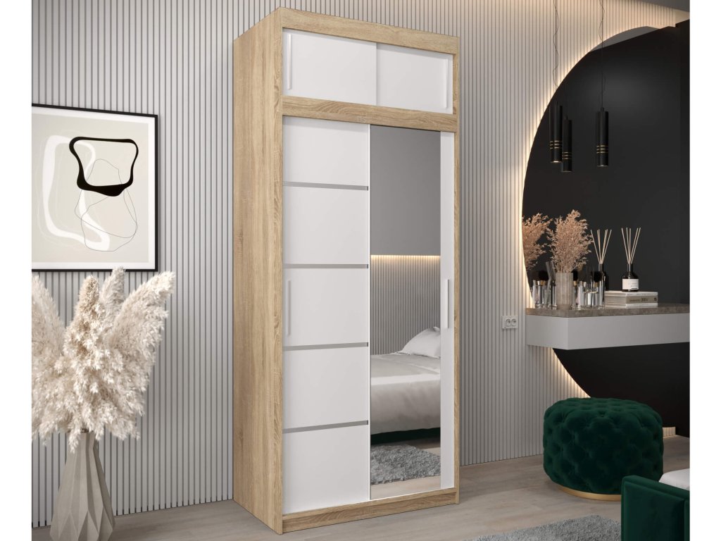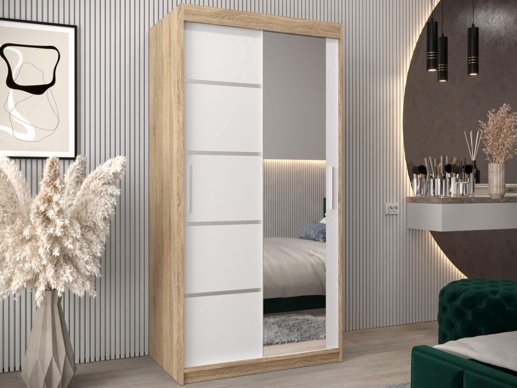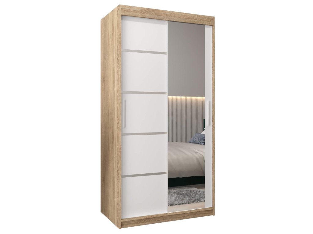 Skriňa so zrkadlom Alyxia II 100/120 v modernej kombinácii dubu sonoma s bielou. Skriňa je vyrobená z vysoko kvalitnej laminovanej dosky (DTD) o hrúbke 16 mm, ktorá je odolná voči poškriabaniu, vlhkosti a vysokej teplote. Hrany skrine sú upravené kvalitnou PVC dyhou. Použitý je posúvný systém ,,BIMAK“ a hliníkové vodidlá, ktoré Vám zaručia pohodlné otváranie a zatváranie dverí. Vnútorné rozloženie skrine je rozčlenené na dve časti. Pravá strana je tvorená štyrmi policami, ktoré vytvoria päť praktických úložných priestorov a na ľavej strane sa nachádza jedna polička a dve vešiakové tyče.
