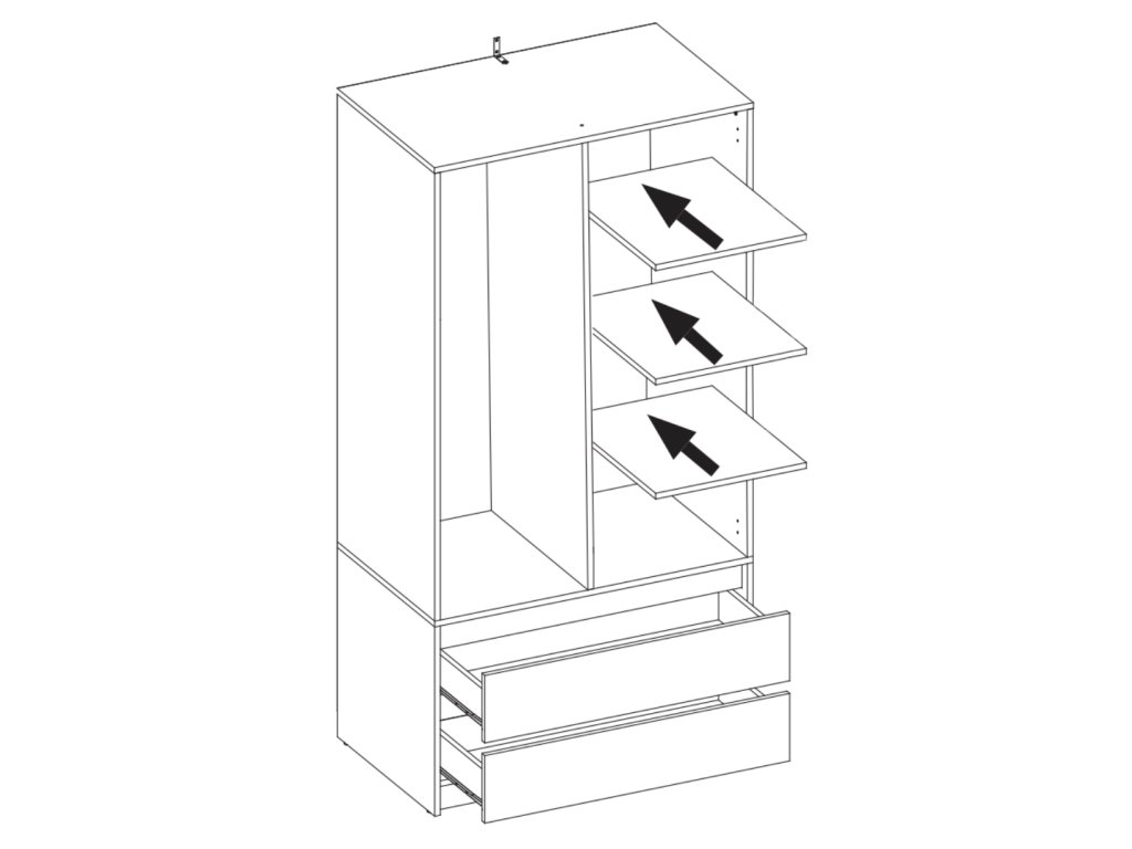Skriňa je vybavená vešiakovou tyčou na zavesenie oblečenia. V spodnej časti sa nachádzajú dve priestranné zásuvky.
