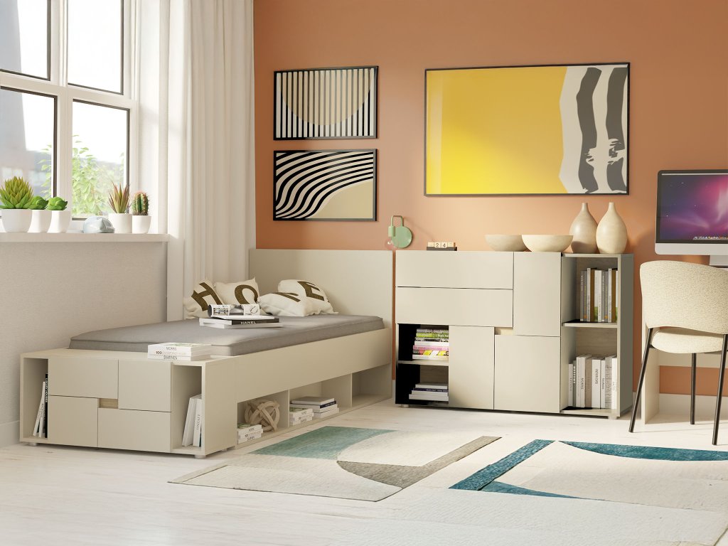 - Komoda Lens 2S – praktická komoda v kašmírovom odtieni, vhodná aj ako nočný stolík k posteli z tejto kolekcie. Vyrobená z odolných materiálov, ktoré zaručia jej dlhú životnosť.