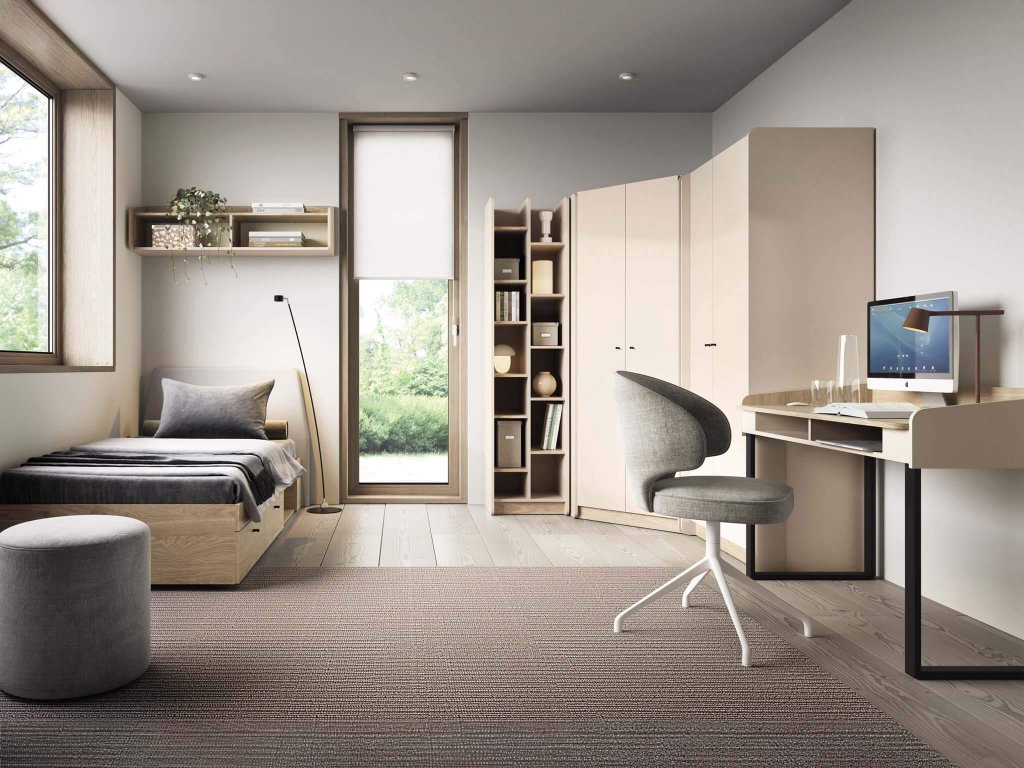 Študentská izba ALESSIO pozostáva z 6 ks nábytku: rohová šatníková skriňa, dvojdverová šatníková skriňa, písací stôl, vysoký regál, jednolôžková posteľ a nástenná polica.