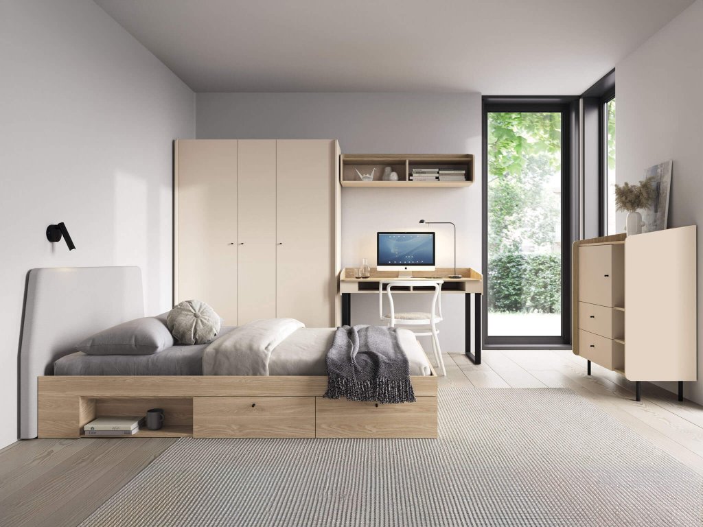Ak hľadáte štýlovú a funkčnú študentskú izbu, ktorá má všetko čo váš študent potrebuje, tak ste ju možno práve našli. Predstavujeme vám študentskú izbu ALESSIO v zaujímavom pieskovom farebnom prevedení v kombinácií s detailmi v dekore olejovaného duba. Táto kompletná sada nábytku obsahuje všetko, čo vaša ratolesť potrebuje na štúdium, relax a uloženie vecí. Nábytok z tejto kolekcie je vyrobený z rýdzej laminovanej dosky o hrúbke 16mm. Rohy nábytku sú potiahnuté ABS hranami ktoré zabezpečujú pevnosť hrán a odolnosť proti poškriabaniu a nárazom. Všetky rukoväte na záskuvkách a skrinkách sú z kovu a v matnom čiernom prevedení. Nohy na vybranom nábytku sú masívne a kovové v takom istom farebnom prevedení ako aj rukoväte. Zadná strana nábytkových jednotiek a dno zásuviek sú vyrobené z HDF dosky ktorá garantuje pevnosť a odolnosť.