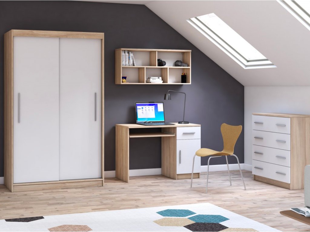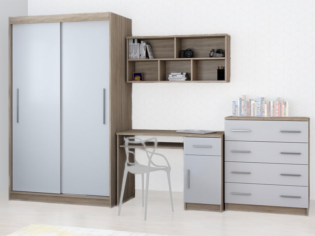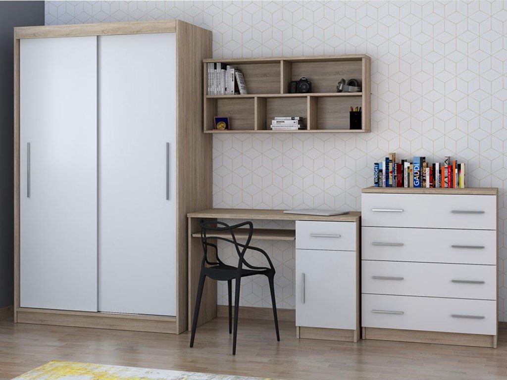 Študentské izba Kornia 2 pozostáva zo štyroch kusov nábytku skrine, komody, písacieho stola a police.