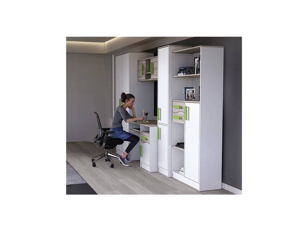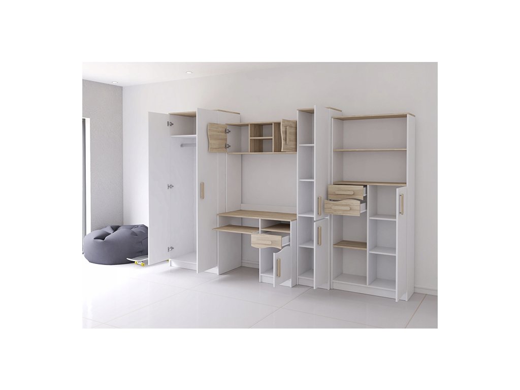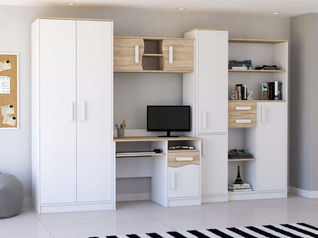 Študentská izba Markus sa skladá z 5 ks nábytku: písacieho stola, šatníkovej skrine, 2 ks regálov a police nad písací stôl. Každý prvok súpravy je samostatný, takže môžete detskú izbu zariadiť v akejkoľvek kombinácii.
