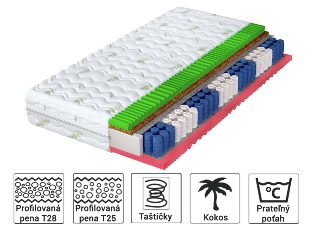 Materiálové zloženie: Filc, NanoHARD taštičkové pružiny, Kokosová vrstva, Polyuretánová PUR pena T25 a T28, Poťah