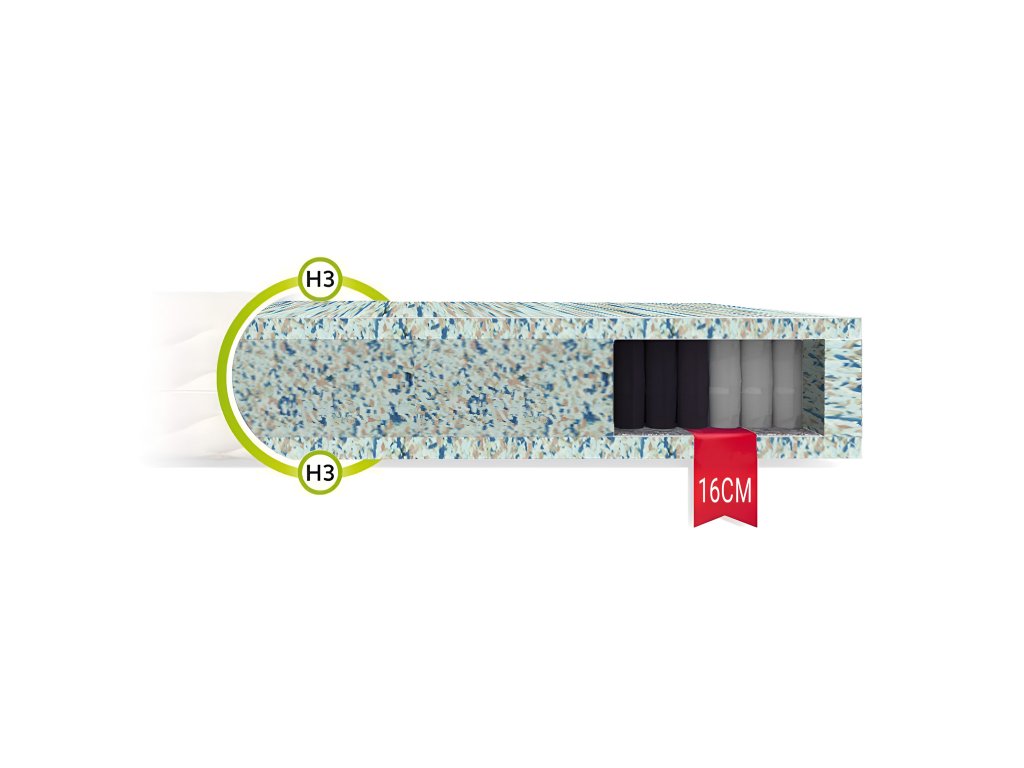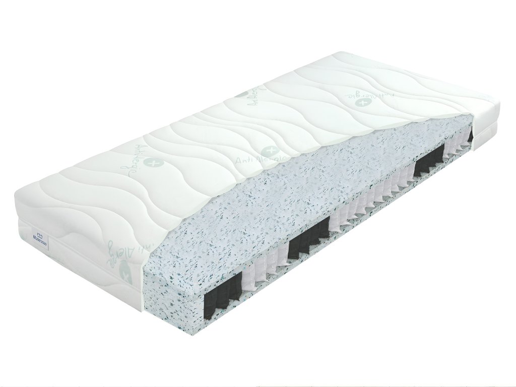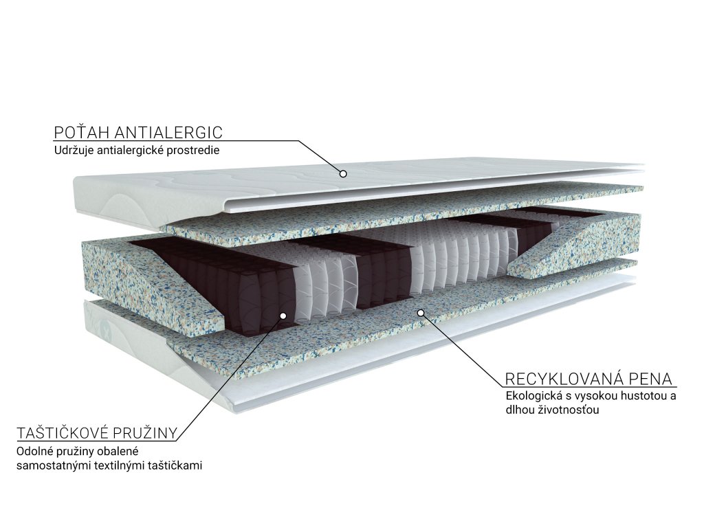 Materiálové zloženie: Taštičkové pružiny, ECO pena, odzipsovateľný antialergický poťah prešitý s PES vláknom s hustotou 200 g/m2