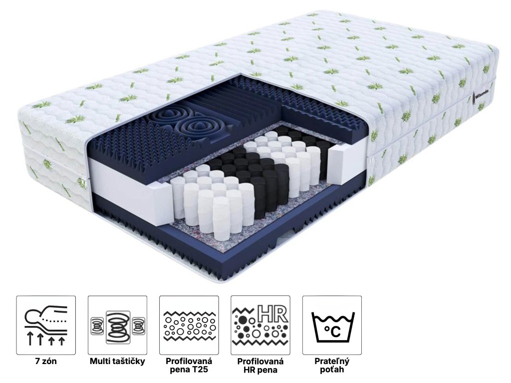 Materiálové zloženie: Filc, Taštičkové multipocket pružiny, Polyuretánová pena s hustotou 25 kg/m3, Profilovaná HR pena, Poťah