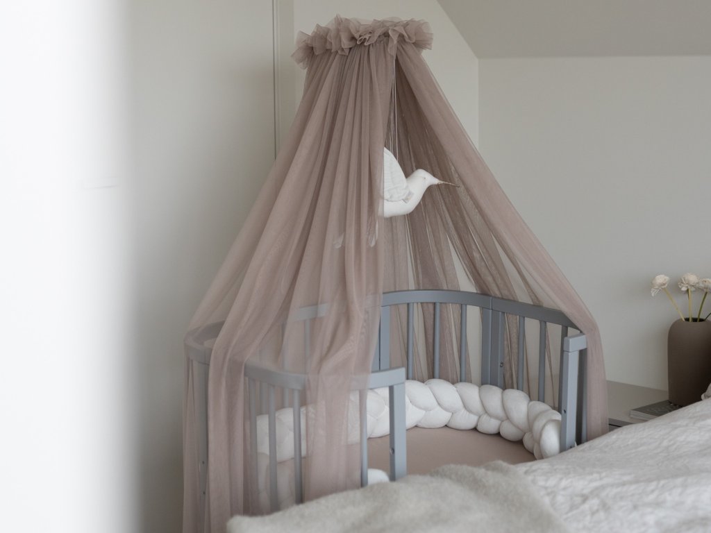 Hnedý tylový baldachýn k rastúcim postieľkam 7v1 vo všetkých tvaroch a rozmeroch zútulní nielen samotnú postieľku, ale aj celú spálňu. Baldachýn je tenučký a priesvitný, dieťatko jemne oddelí, ochráni pred hmyzom, ale zároveň ho budete mať stále na očiach a ono vás tiež. Farebný baldachýn nad detskú postieľku je vyrobený z jemného tylu a nad postieľku si ho primontujete pomocou špeciálneho kovového stojana. Baldachýn môžete oprať na 30°C, vyvesiť a nechajte ho voľne vysušiť. Keď ho vyvesíte, baldachýn sa aj sám pekne vystrie. V ponuke máme aj ďalšie farby baldachýnu, ktoré sa hodia k rastúcim postieľkam 7v1.