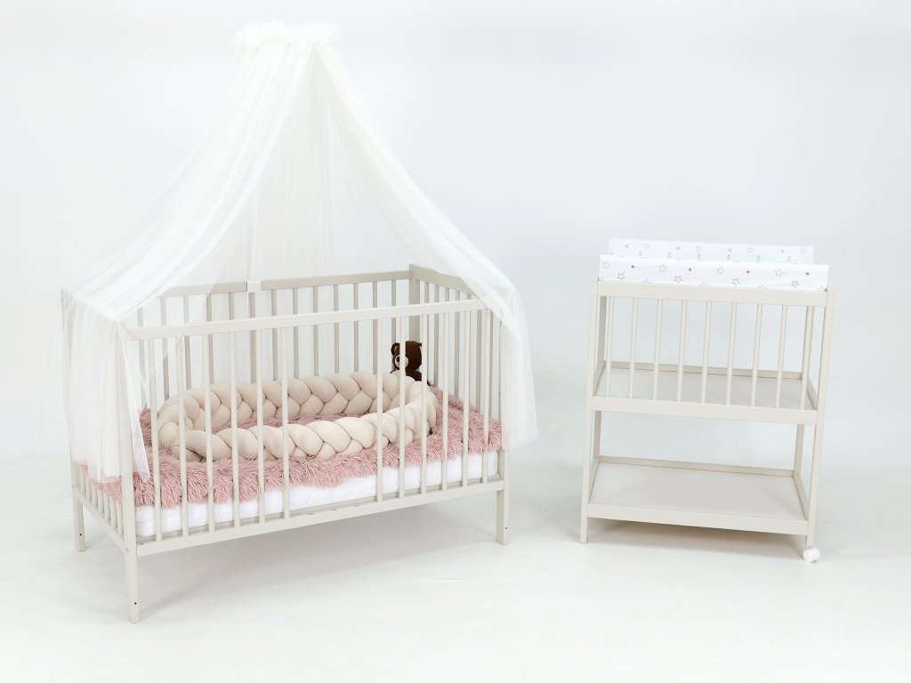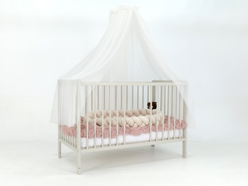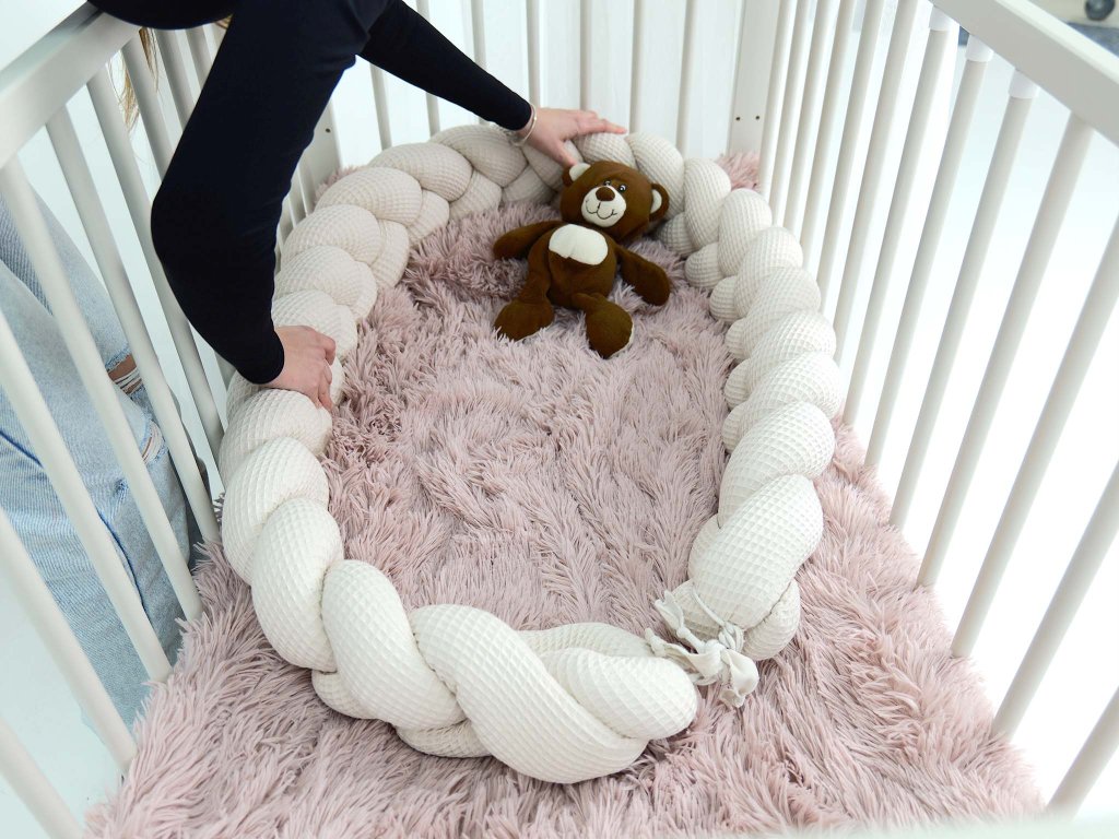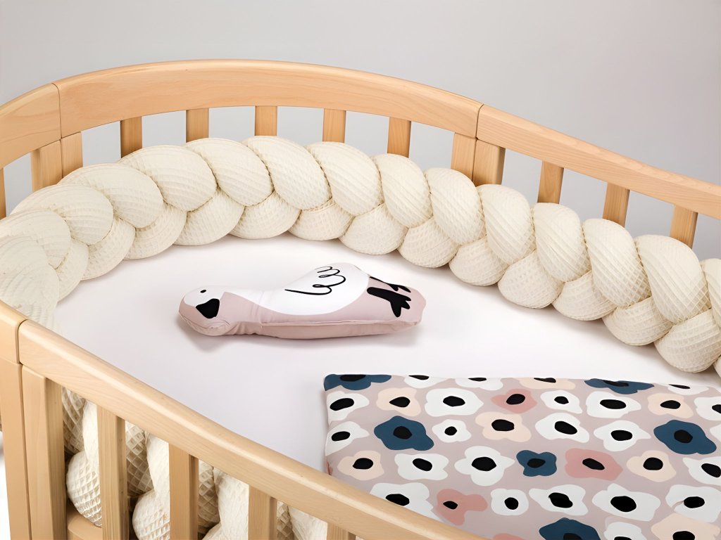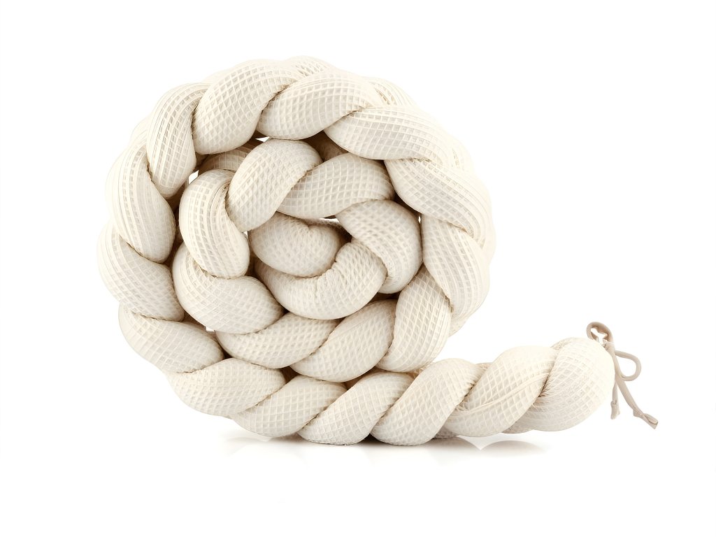 Béžový vrkoč do postieľky 210 cm plní rovnakú funkciu ako ochranný mantinel. Zabraňuje tomu, aby sa detičky nechtiac buchli o drevené priečky v postieľke. Zároveň si ho môžete z postieľky kedykoľvek vybrať a použiť ho na posteli alebo hracej podložke. Pletený vrkoč do detskej postieľky je vysoký 18 cm a široký 10 cm má poťah z bavlny. Výplň vrkoča tvoria silikónové guličky. Oba materiály majú certifikát kvality OEKO-Tex Standard 100, čo znamená, že neobsahujú žiadne škodlivé chemikálie a sú bezpečné pre deti. Vrkoč na postieľku priviažete pomocou šnúrok, ktoré sú naň všité.