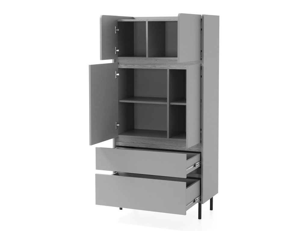 Vysoká komoda LUCA S5 má dve veľké zásuvky a štyri skrinky s poličkami vo vrchnej časti. Moderný vzhľad komody do detskej izby podporili aj vysoký čierne nožičky z kovu. Vysoký komoda je vyrobená z kvalitnej laminovanej dosky s hrúbkou 16 mm. Hrany sú zakončené odolnou ABS dyhou. Zásuvky a dvierka majú bezúchytové otváranie. V kolekcii nájdete aj ďalšie modely, ktoré si môžete nakombinovať podľa svojich potrieb a priestoru v detskej izbe.