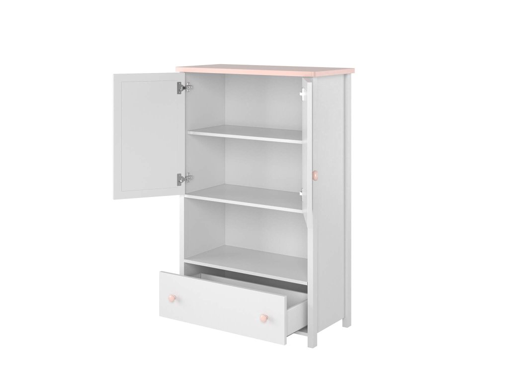 Vysoká komoda LUNA navhrnutá do dievčenskej detskej izby má biely korpus a detaily v púdrovo ružovej. Je vyrobená z kvalitnej laminovanej dosky s hrúbkou 16 mm. Hrany sú zakončené ABS dyhou. Ružové úchytky sú vyrobené z plastu. V dolnej časti komody je umiestnená priestranná zásuvka a nad ňou vyššia otvorená polica. V hornej časti komody je uzatvárateľná skrinka s dvomi policami. Kolekcia LUNA osloví všetky dievčatá, ktoré milujú rozprávky o princeznách alebo vílach.