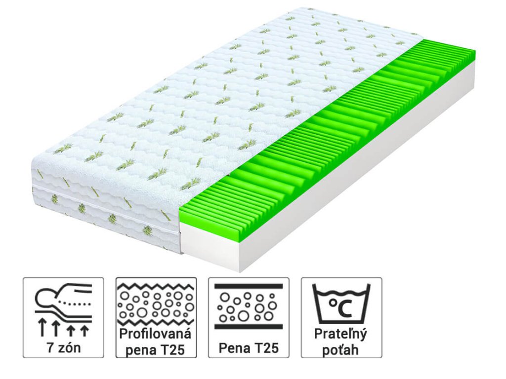 Vysokokvalitná 7-zónová pena s profilovanou štruktúrou je navrhnutá tak, aby podporovala správnu cirkuláciu krvi a uvoľňovanie svalstva počas spánku. Reaguje na telesnú teplotu, čo jej umožňuje prispôsobiť sa kontúram tela a zlepšiť celkový komfort spánku. Systém rôznych tvrdostí v jednotlivých zónach poskytuje optimálnu podporu chrbtici a zaisťuje prirodzenú polohu tela. Tento materiál je tiež ideálny pre osoby trpiace alergiami.