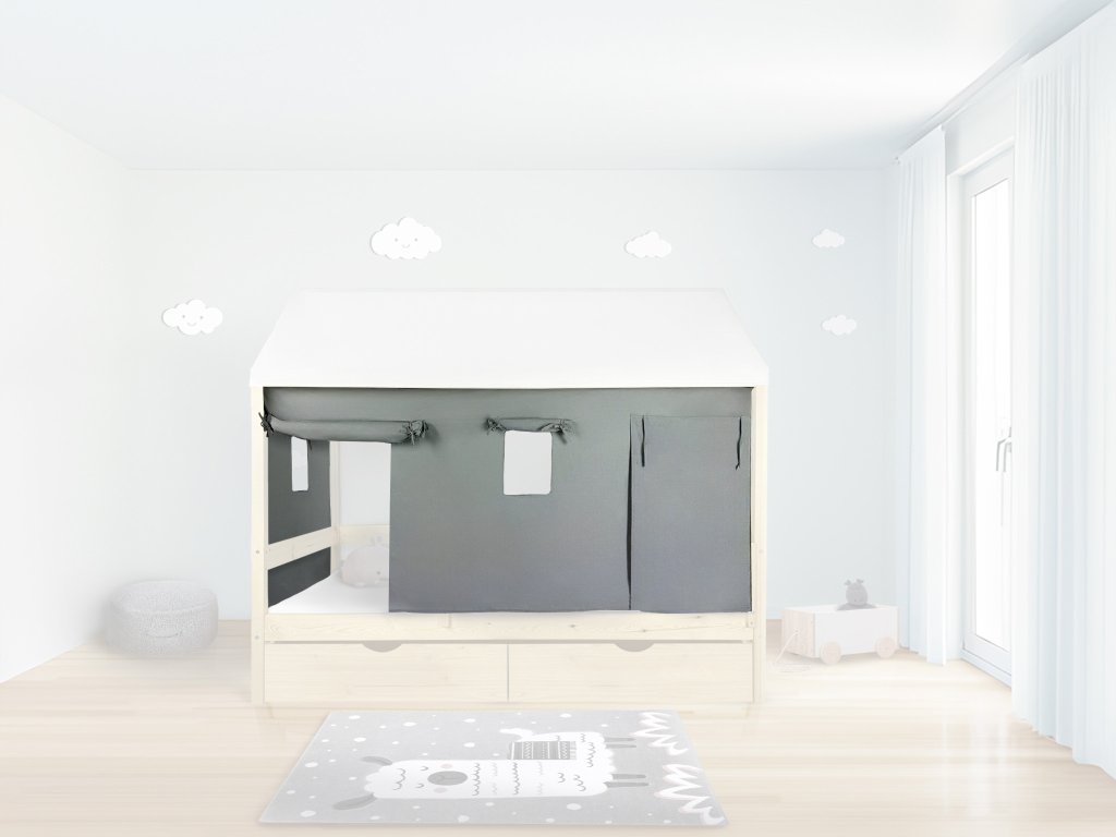 Záclonka na domčekovú posteľ Pery predstavuje jedinečný a praktický doplnok, meniaci posteľ na rozprávkový príbytok. Táto záclonka je vyrobená z kvalitnej sivej látky, ktorá sa ľahko udržiava a je odolná voči opotrebovaniu, čo zabezpečuje dlhú životnosť produktu. Je navrhnutá s jednoduchou inštaláciou, vďaka systému na suchý zips, ktorý umožňuje rýchle a bezproblémové pripevnenie k posteli bez potreby náradia. Tento produkt je obohatený o premyslené detaily, ako sú okná a dvierka, ktoré nie len zvyšujú estetickú hodnotu, ale tiež podporujú kreatívnu hru a rozvoj predstavivosti vašich detí. Záclonka na domčekovú posteľ Pery tak poskytuje súkromný a útulný priestor, kde si deti môžu čítať, hrať sa alebo odpočívať, čím zároveň obohacuje celkovú atmosféru detskej izby.